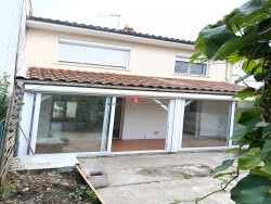 Carbon Blanc A proximité du tramway, maison mitoyenne à étage, en bon état comprenant: entrée, séjour avec cheminée, cuisine équipée, véranda ouverte sur le séjour et la cuisine qui agrandit la pièce à vivre, wc, salle d'eau. A l'étage: palier, 3 chambres, wc, salle d'eau. Garage - jardinet devant et derrière.