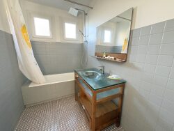 Au rez-de-chaussée, une pièce de vie donnant sur la cour de la maison et le jardin, une cuisine aménagée et équipée, deux chambres, une salle de bain, un WC indépendant et un placard.