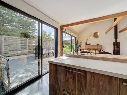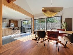 Le coeur de la maison se dévoile au niveau du jardin : une pièce de vie traversante, sublimée par une hauteur cathédrale et un parquet en bois massif. La cuisine ouverte dialogue naturellement avec le salon et le séjour, dans une atmosphère baignée de lumière grâce aux larges baies vitrées orientées plein sud. La terrasse prolonge cet espace entre intérieur et extérieur. Ce niveau dispose également d'une salle de bain avec douche, d'un dressing et d'un WC indépendant
