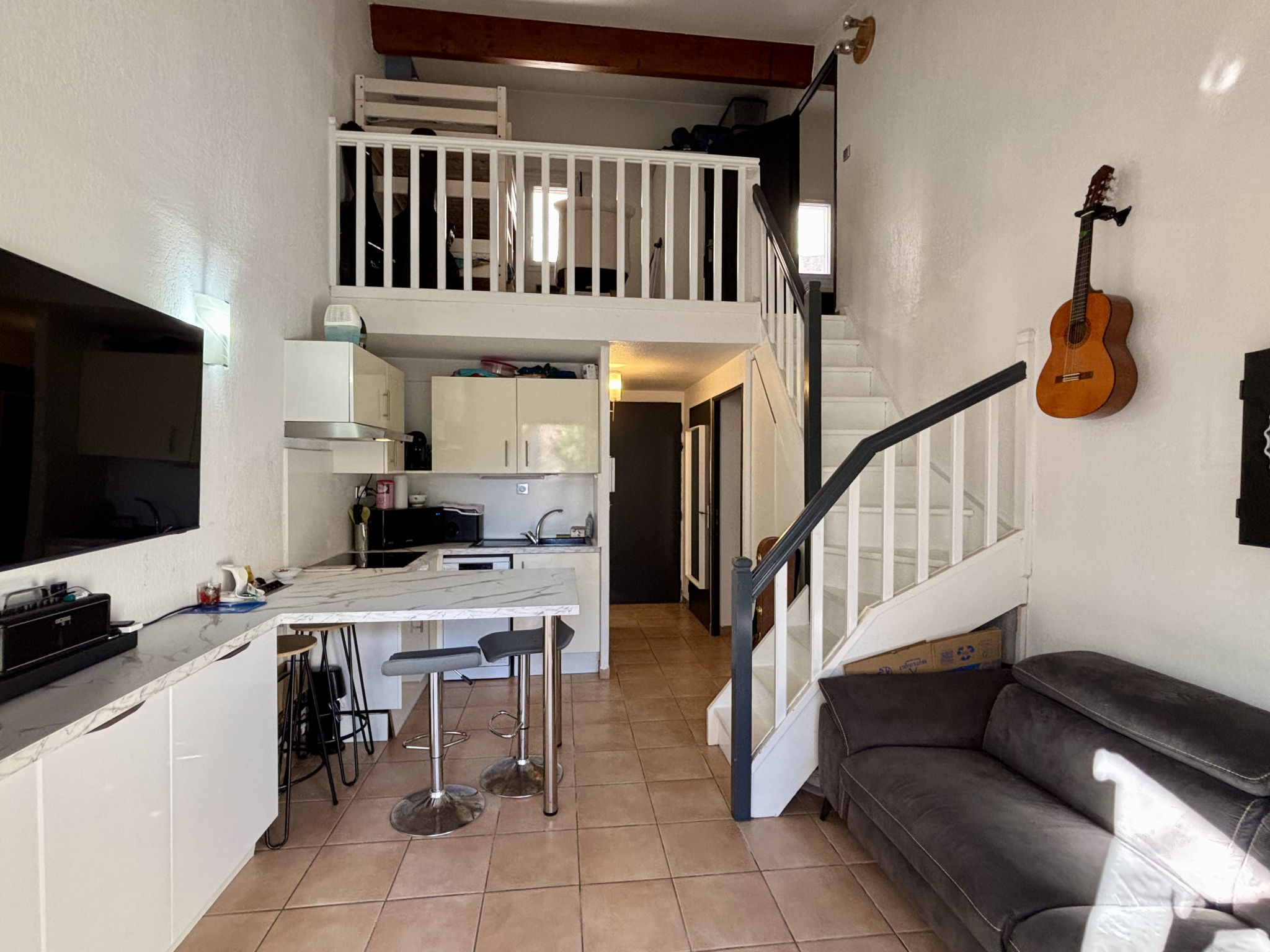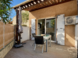 Venez découvrir cette charmante maison et sa terrasse arborée à l'abri des regards (exposition sud-ouest). A l'intérieur, vous trouverez le séjour avec une cuisine équipée, une chambre, une salle d'eau (entièrement rénovée il y a quelques mois) et des WC séparés. A l'étage, une mezzanine haute avec fenêtre (10 m² environ). Résidence calme, sécurisée et bien entretenue. Proche des proches des plages, du Golf, des activités de loisirs, des commerces et des restaurants.