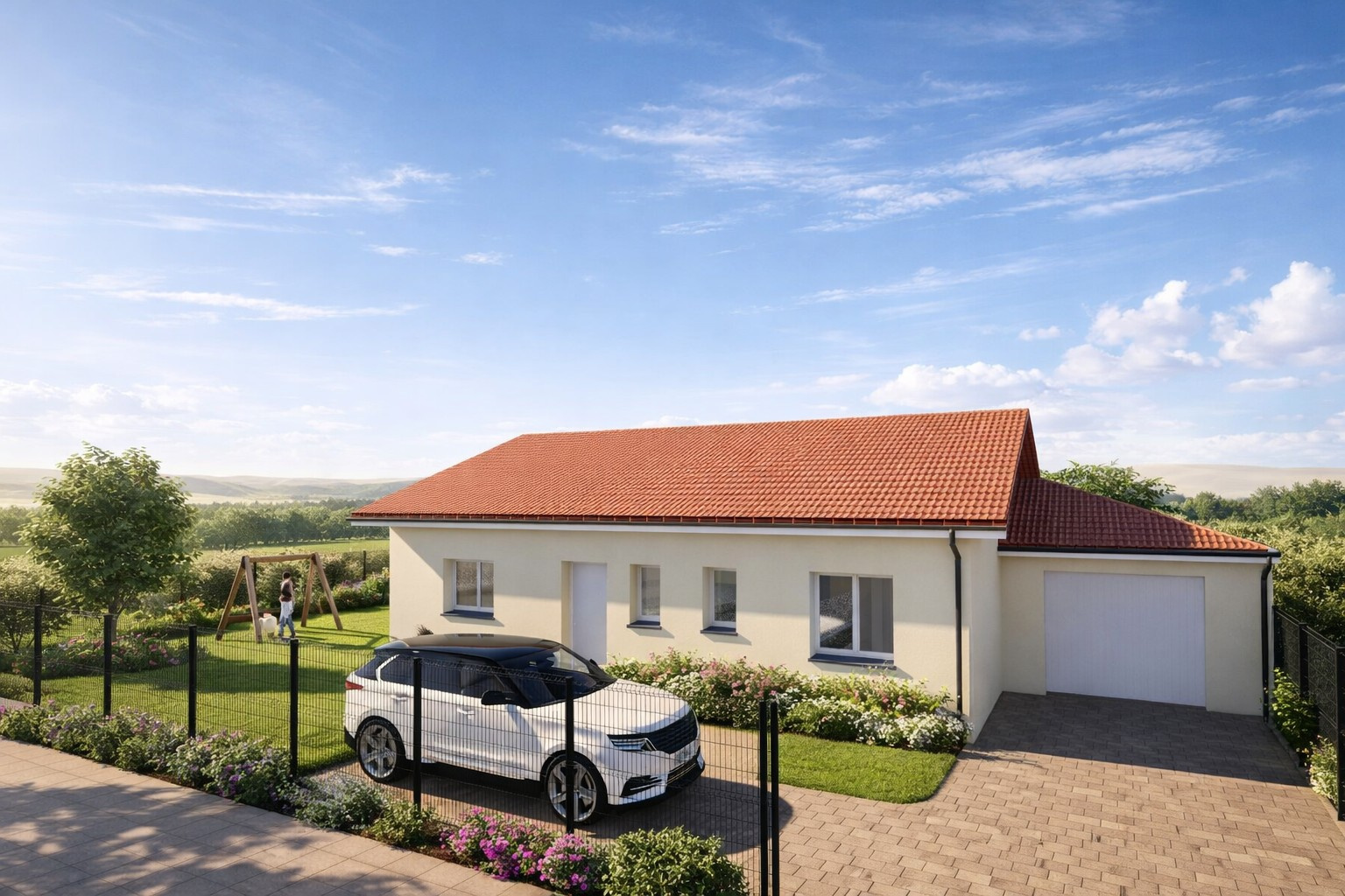 Au rez-de-chaussée, vous découvrirez une cuisine équipée ouverte sur une grande pièce de vie lumineuse et conviviale. Ce niveau comprend également un cellier, une chambre avec placard mural, une buanderie avec douche, des toilettes indépendants ainsi qu'un garage.