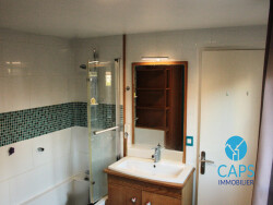Au rez-de-chaussée, vous trouverez un salon / salle à manger séparés par une porte coulissante, un couloir desservant une cuisine aménagée et équipée, un espace buanderie et un WC.