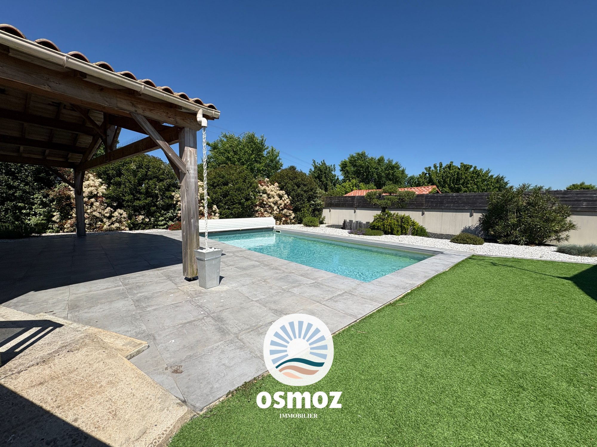Découvrez cette magnifique maison plain-pied de 123 m², construite en 2006 et en excellent état. Située dans un cadre idyllique, cette propriété allie modernité et confort pour une vie de famille harmonieuse. Avec ses 5 pièces, dont 4 chambres spacieuses, cette maison offre un espace de vie généreux. Le séjour de 59 m² est baigné de lumière grâce à ses grandes ouvertures en aluminium, offrant une vue imprenable sur le jardin et la terrasse. La cuisine américaine, aménagée et équipée, est un véritable espace de vie convivial. Profitez d'un jardin luxuriant et d'une piscine pour des moments de détente inoubliables. La maison dispose également d'une cave et d'un stationnement intérieur et extérieur pour un confort optimal. Les commodités les plus proches incluent plusieurs écoles, un supermarché et des restaurants à moins de 10 minutes en voiture.