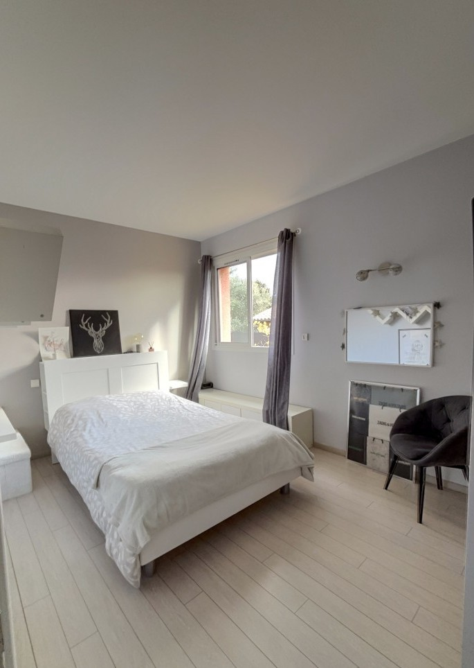 A l'étage, en mezzanine, deux chambres, un espace bureau et une salle d'eau. Dans le très beau jardin arboré avec de très grands pins, il y a un abri de jardin très pratique pour ranger les outils et les machines. Il y a également un abri pour la machinerie de la piscine.