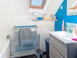 A l'étage, un palier dessert ; trois belles chambres lumineuses et une salle de bains avec baignoire et un WC. Grand jardin avec terrasse. Garage.