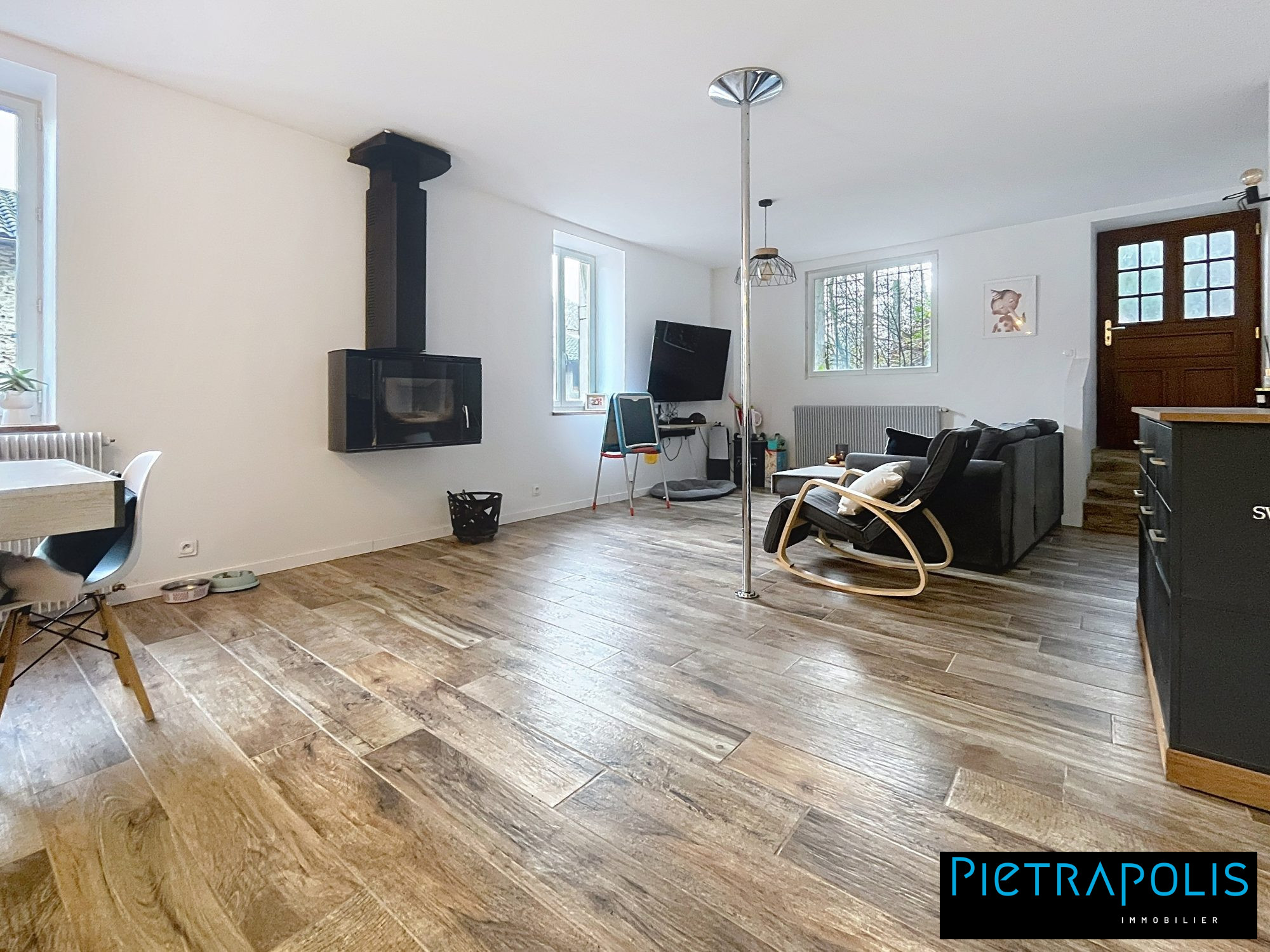 Au rez-de-chaussée, vous trouverez une cuisine américaine aménagée et équipée, idéale pour les passionnés de cuisine. Les ouvertures en PVC et les portes à double vitrage garantissent une isolation optimale, tandis que la toiture, suivie en 2008 et isolée avec de la laine de verre en 2019, assure une protection contre les intempéries.