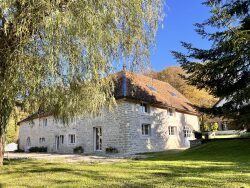 A seulement 10 minutes de BESANCON, ce domaine, composé de plusieurs corps de ferme, est situé au coeur d'un environnement naturel préservé, offrant un terrain clos de 1,155 hectare sans vis-à-vis, garantissant ainsi une parfaite intimité. Datant de 1788, cette propriété de caractère comprend trois bâtiments en pierre, soigneusement restaurés, avec des poutres apparentes, et une surface habitable totale de 430 m². Elle associe harmonieusement l'authenticité de l'ancien à des prestations modernes. Le premier bâtiment, situé à proximité de la piscine, est un espace dédié à la détente et à la convivialité. Sous une charpente en bois apparente, une grande salle de réception avec une cheminée en pierre permet de recevoir et de partager des moments agréables. Les matériaux d'origine, tels que les poutres et murs en pierre brute, préservent le cachet historique du lieu tout en offrant un confort actuel. La maison principale, baignée de lumière naturelle, se compose d'un vaste séjour exposé plein sud, avec des matériaux nobles qui rappellent le caractère historique du bâtiment. Le rez-de-chaussée comprend également un coin repas, une cheminée à foyer ouvert, un four traditionnel, ainsi qu'une cuisine indépendante et entièrement équipée. À l'étage, une grande salle de loisirs abrite un billard et des espaces de détente. L'étage dispose également de plusieurs chambres, dont une suite parentale spacieuse. Le troisième bâtiment à rénover, présente un potentiel important pour un projet de restauration supplémentaire, offrant ainsi diverses possibilités d'aménagement. Ce bien rare, combinant charme authentique et confort moderne, constitue un lieu idéal pour des moments en famille ou entre amis, dans un cadre préservé.