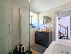 Le rez-de-chaussée se compose d'une entrée desservant une cuisine ouverte aménagée et équipée et un salon-séjour-salle à manger. Un dégagement mène à un WC indépendant, une salle de bains avec baignoire balnéo et douche, ainsi qu'un espace de rangement sous l'escalier.