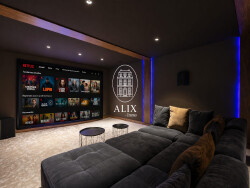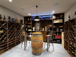 Le sous-sol, entièrement aménagé, propose une salle cinéma avec une belle hauteur sous plafond, équipée d'un système audio haut de gamme et d'un vidéoprojecteur 4K, une cave à vin vitrée, un espace de stockage et de nombreux rangements.