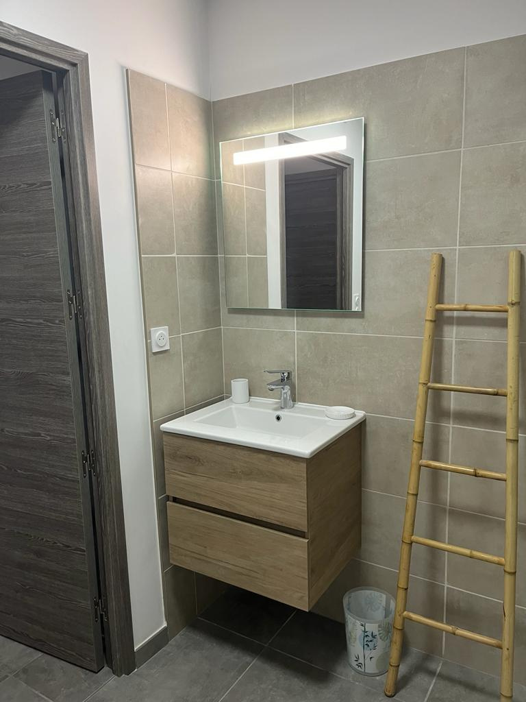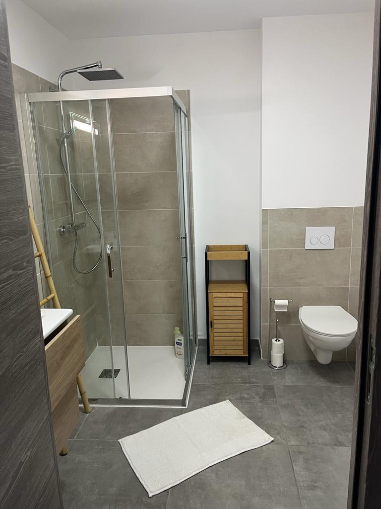 D'une superficie de 55m2, elle est composée d'une pièce à vivre avec cuisine ouverte donnant sur une terrasse de 16 m2 prolongée d'un espace vert, de 2 chambres, d'une salle de bain et wc séparé.