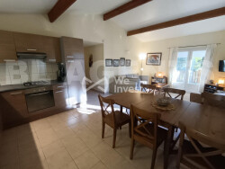 À l'extérieur, une vaste terrasse partiellement couverte prolonge harmonieusement l'espace de vie. Véritable invitation à la détente, elle accueille aussi bien vos repas d'été que vos instants de repos face à la nature environnante. Pour votre confort en toute saison, la villa est équipée d'une climatisation neuve, garantissant un bien-être optimal, été comme hiver.