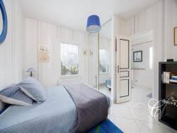 Le rez-de-chaussée L'entrée principale est accessible par le portillon et s'ouvre sur un grand espace de vie d'environ 30m2 composé d'un séjour tourné vers la mer et d'une salle à manger qui se poursuit à l'ouest vers la terrasse et la véranda. La lumière entre par les nombreuses baies vitrées créées judicieusement pour une clarté à tout moment de la journée. Chauffé par un poêle à granulés au design contemporain épuré, cet espace spacieux est une invitation à la tranquillité. La cuisine au nord est ouverte bien que légèrement en retrait des pièces principales jouant sur la convivialité tout en maintenant son propre espace. Elle donne également sur le salon d'hiver et est orientée vers le jardin arrière de la maison. Une chambre et sa salle de douche attenante donnant sur le jardin arrière ainsi que des toilettes indépendantes complètent ce niveau. Un accès au sous-sol et garage directement depuis le rez-de-chaussée apporte une fonctionnalité bienvenue pour le quotidien (courses, buanderie, ) Le premier étage L'escalier en bois mène à un palier pensé comme une mezzanine et aménagé à la façon d'un salon de conversation. Trois chambres spacieuses au nord, à l'ouest et au sud ainsi qu'une salle de bain et des toilettes indépendants tournent autour de ce palier. Au sud, les ouvertures de la chambre principale plongent dans la baie de Cancale au -dessus de la baie de la Ragonde et l'on aperçoit le mythique Mont Saint Michel lorsque la brume du matin se dissipe. Le sol est en parquet, les murs sont blancs ou tapissés de papier peint chacun avec sa note de couleur ou de motifs et l'ensemble apportent une belle lumière à cet étage. Le sous-sol surélevé s'étend sur la surface entière de la maison, comme un étage en plus et permet d'entreposer tous les éléments qui apportent une fonctionnalité essentielle en bord de mer : buanderie, congélateur et réfrigérateur, garage à voiture avec portail électrique, grands espaces de rangement.