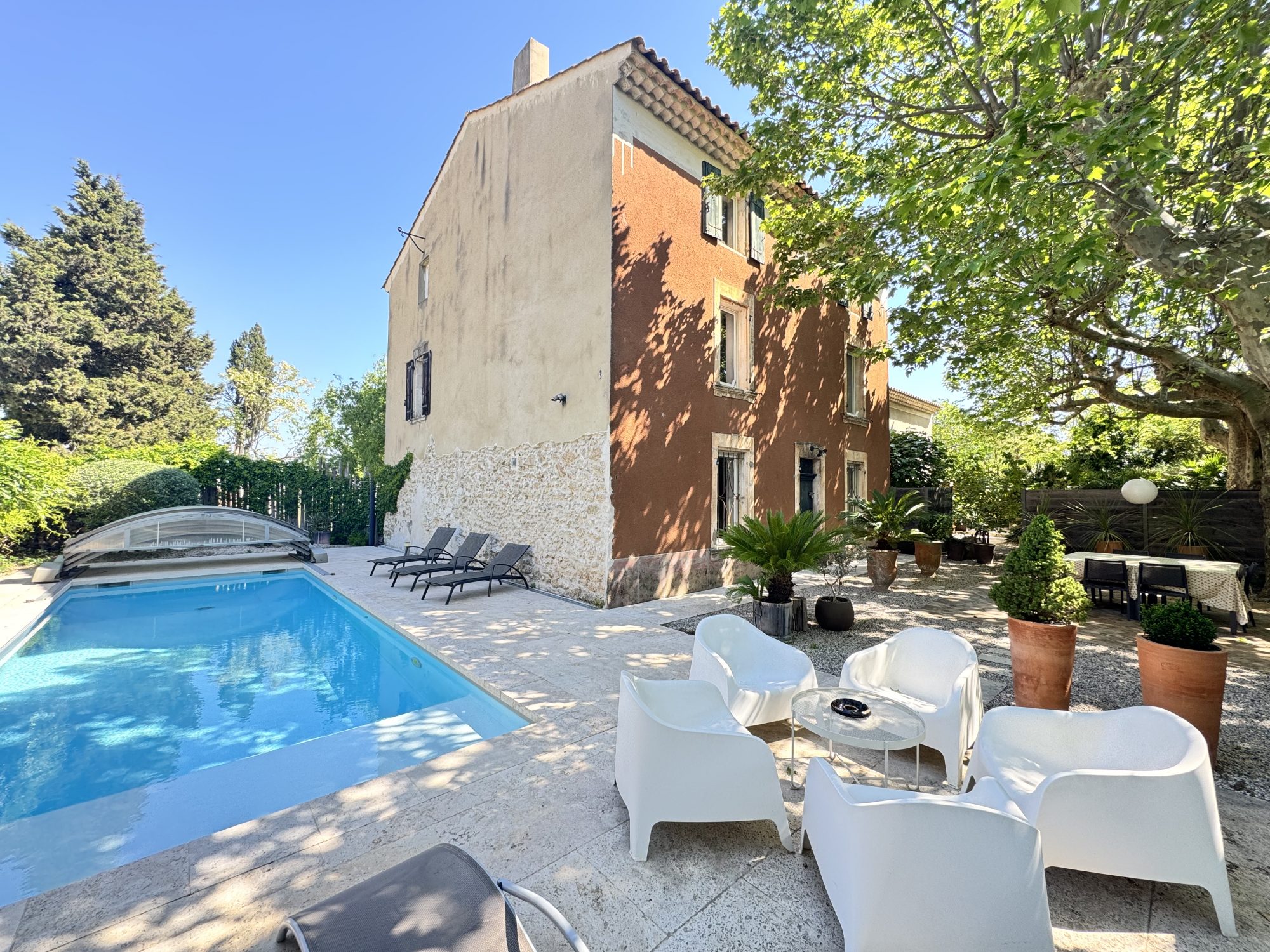 Imaginez-vous chaque matin, éveillé par le chant des oiseaux, dans une **magnifique demeure de 170 m²**, bâtie en 1983, où le temps semble s'être arrêté pour mieux savourer l'instant présent. Cette maison allie le charme intemporel des pierres apparentes et des boiseries chaleureuses à une modernité discrète, créant une atmosphère à la fois **confortable et raffinée**.