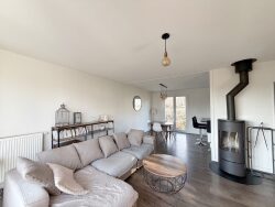 Cet espace se compose d'un séjour chaleureux, agrémenté d'un poêle à bois, d'une salle à manger conviviale et d'une grande cuisine entièrement équipée, ouverte et dotée d'un bel îlot central, idéale pour recevoir.