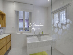 Dans un cadre de vie agréable, elle se compose en rez-de-chaussée d'une entrée, d'un double salon, d'un séjour avec vue sur le parc et la piscine, d'une cuisine aménagée, d'une chambre avec placards, d'une salle de bains, de WC indépendants, ainsi que d'une buanderie, d'une salle de jeux, d'un cellier et d'un dressing. À l'étage, vous trouverez deux chambres et une salle d'eau, WC.