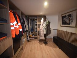 Vous pourrez garer à l'abris sous un porche deux véhicules. Une buanderie, une annexe pour le rangement et un buché vous permettront de stocker les meubles de jardin.