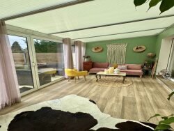 Au rez-de-chaussée :Vous découvrirez un hall d'entrée avec verrière, apportant du cachet dès l'arrivée.Un grand salon moderne et spacieux, baigné de lumière grâce à sa baie vitrée, s'ouvre sur une véranda cosy, chauffée et très agréable à vivre toute l'année. très joli carrelage moderne dans le salon et la véranda, apportant élégance et harmonie aux espaces de vie. La véranda donne accès à un jardin bien entretenu, parfait pour profiter des beaux jours en toute tranquillité.Une cuisine moderne, meublée et équipée, dispose également de son propre accès extérieur.