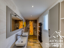 Découvrez : Au rez-de-chaussée: -Une entrée de 15m2 avec rangements intégrés. Une cuisine haut de gamme ouverte sur la salle à manger de 50m2, baignée de lumière et dotée d'un poêle à bois pour une ambiance chaleureuse. Accès direct à une terrasse conviviale. -Une Family Room de 45m2 avec salle d'eau et WC offre une polyvalence totale : suite parentale, salle de cinéma, salle de sport ou un logement locatif. -Une salle d'eau élégante de 10m2 : double vasque et double douche Italienne, mur en feuille de pierre rétro-éclairées pour une atmosphère apaisante et raffinée. WC indépendant.