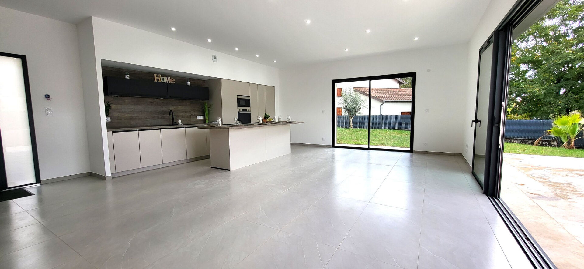 Les atouts Maison clé en main (aucun travaux) Cuisine équipée installée (four, plaque, hotte, lave-vaisselle) 3 chambres, dont suite parentale avec douche et meuble vasque Salle de bain (douche ou baignoire), double vasque, miroir LED WC indépendant Grande baie vitrée anthracite, volets roulants motorisés Climatisation gainable Carrelage grand format 60×120 (murs inclus) Garage avec porte motorisée (plafond en placo) Chemin d'accès fini en Balthazar Terrain clôturé hors portail.