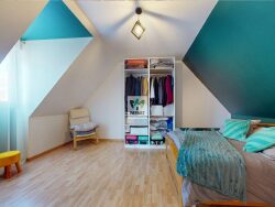 À l'étage, vous trouverez une vaste chambre ainsi que deux autres chambres mansardées avec placards intégrés. Sur le palier, vous profiterez d'un toilette, qu'il sera possible de modifier en salle d'eau, puisque les branchements pour une douche sont déjà présents.