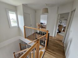 Agréable maison mitoyenne d'un côté de 86 m2 sur un terrain de 240m2. Elle se compose d'une entrée, d'une belle pièce de vie lumineuse traversante avec une cuisine aménagée et équipée donnant sur une grande terrasse avec vue sur la forêt. Au rdc vous trouverez également un wc, et un garage avec un coin buanderie de 18m2. A l'étage un dégagement dessert 3 chambres, une salle de bain et un wc indépendant. Vous profiterez d'un agréable jardin sur 3 côtés avec terrasse. La maison est équipée d'un poêle à granulés, de fenêtres et portes fenêtres PVC double vitrage avec volets roulants qui fonctionne avec des panneaux solaires. Située au calme dans un lotissement et proches des commodités (bus, tram D et commerces) et du Domaine du Pinsan