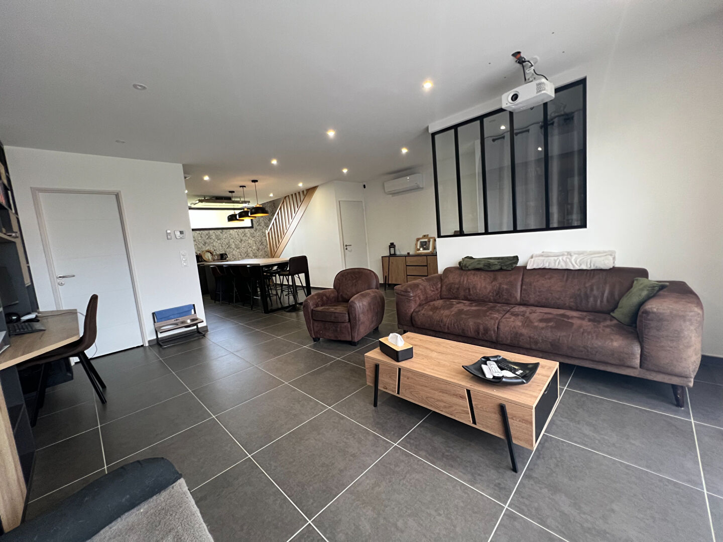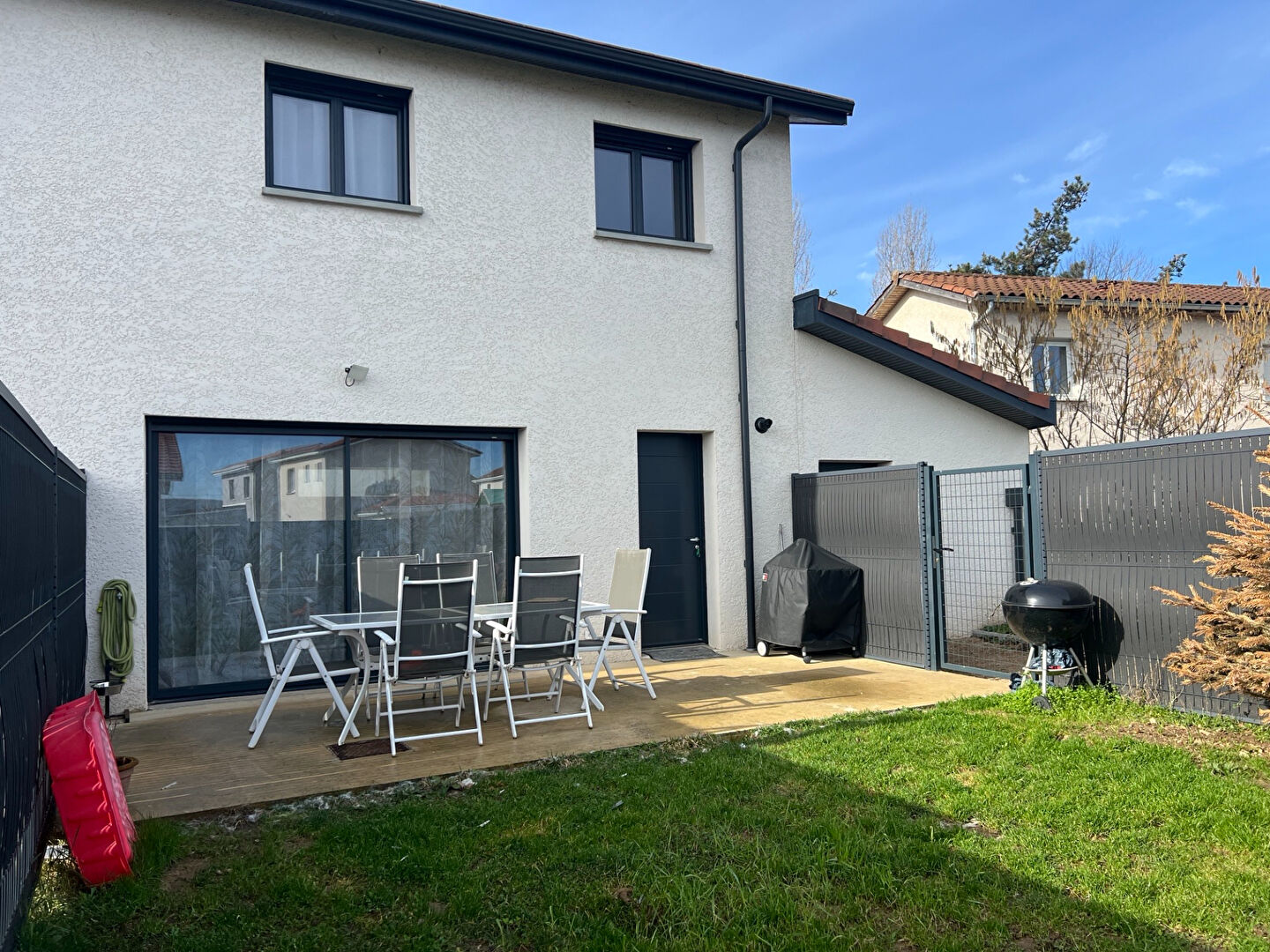 - Informations et caractéristiques de la maison : . Construction de 2010 . Superficie totale de 112m² . Surface habitable de 92m² . Terrain d'environ 190m² . Terrasse de 13,49m² . Une place de stationnement . Volets électriques . Hors copropriété / Hors lotissement . Garage (avec mezzanine) . Menuiseries double vitrage . Système d'alarme . Chauffage électrique . Chauffage au sol dans la pièce de vie . Tout à l'égout . Fibre