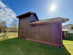 Grande dépendance en bois avec mezzanine, deuxième dépendance en bois avec garage et cuisine d'été et cellier. Garage en dur. Abri bois