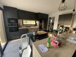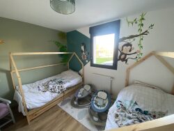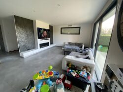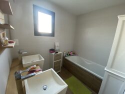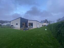 A environ 2km du bourg, maison de plain-pied construite en 2021. Elle comprend une entrée avec placards, un beau salon-séjour avec cuisine ouverte, quatre chambres dont une suite parentale avec salle d'eau et dressing, une salle de bains, une buanderie et un garage. Chauffage par pompe à chaleur. Le tout sur un terrain de 900m².
