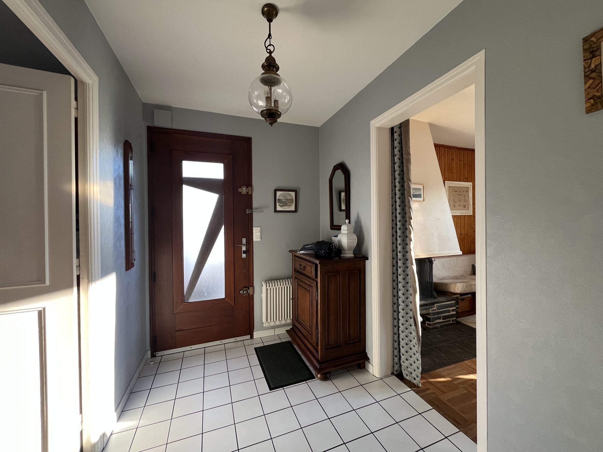 Une très grande entrée Une cuisine indépendante Un WC séparé avec lave-mains Une grande buanderie avec système de chauffage par géothermie Un salon lumineux avec cheminée (foyer ouvert et insert bois) Une chambre avec dressing et salle d'eau privative avec WC À l'étage :
