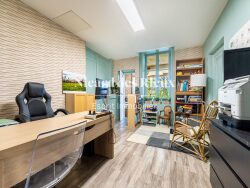 Dès l'entrée, le rez-de-chaussée dévoile deux espaces. L'un est composé d'un salon et de deux chambres, d'un coin cuisine, d'une salle d'eau, complété par des toilettes indépendantes. L'autre comprend un cabinet médical, idéal pour travailler depuis chez soi. De plus, une vaste terrasse couverte de 42 m² constitue un véritable prolongement des pièces de vie.