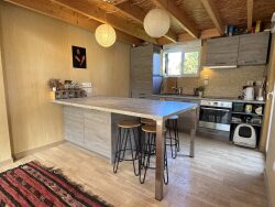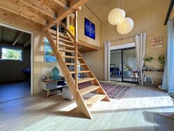 Cette maison en bois récente (2018) séduit par ses volumes et son esprit chaleureux. Sa pièce de vie, avec plus de 4 m de hauteur sous plafond, baigne de lumière et intègre un salon convivial ainsi qu'une cuisine ouverte aménagée et équipée.