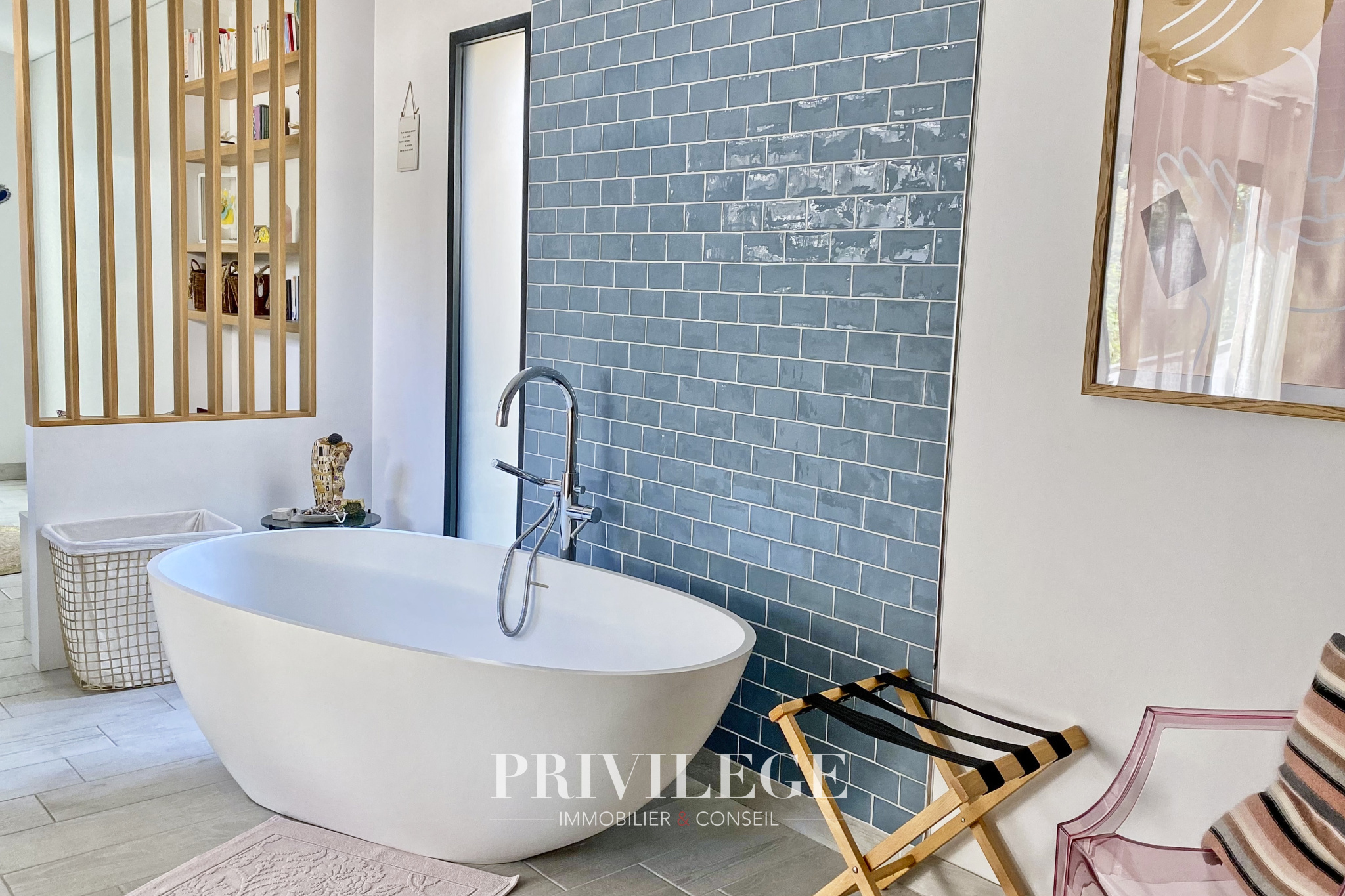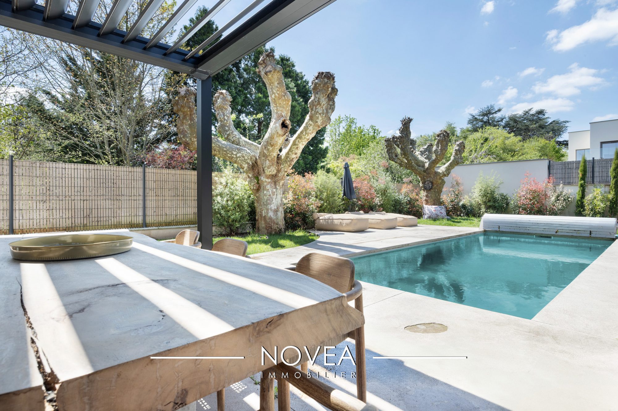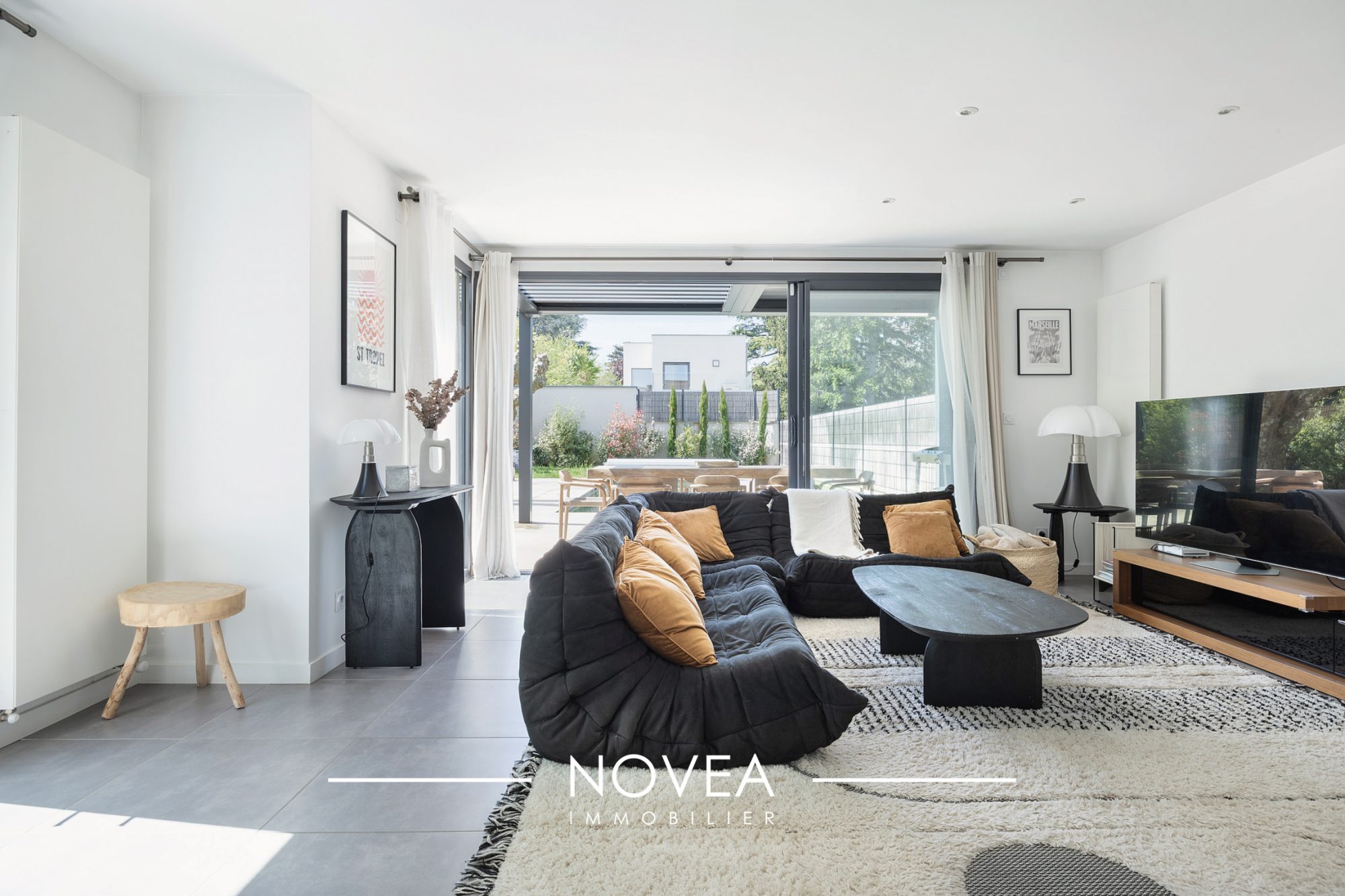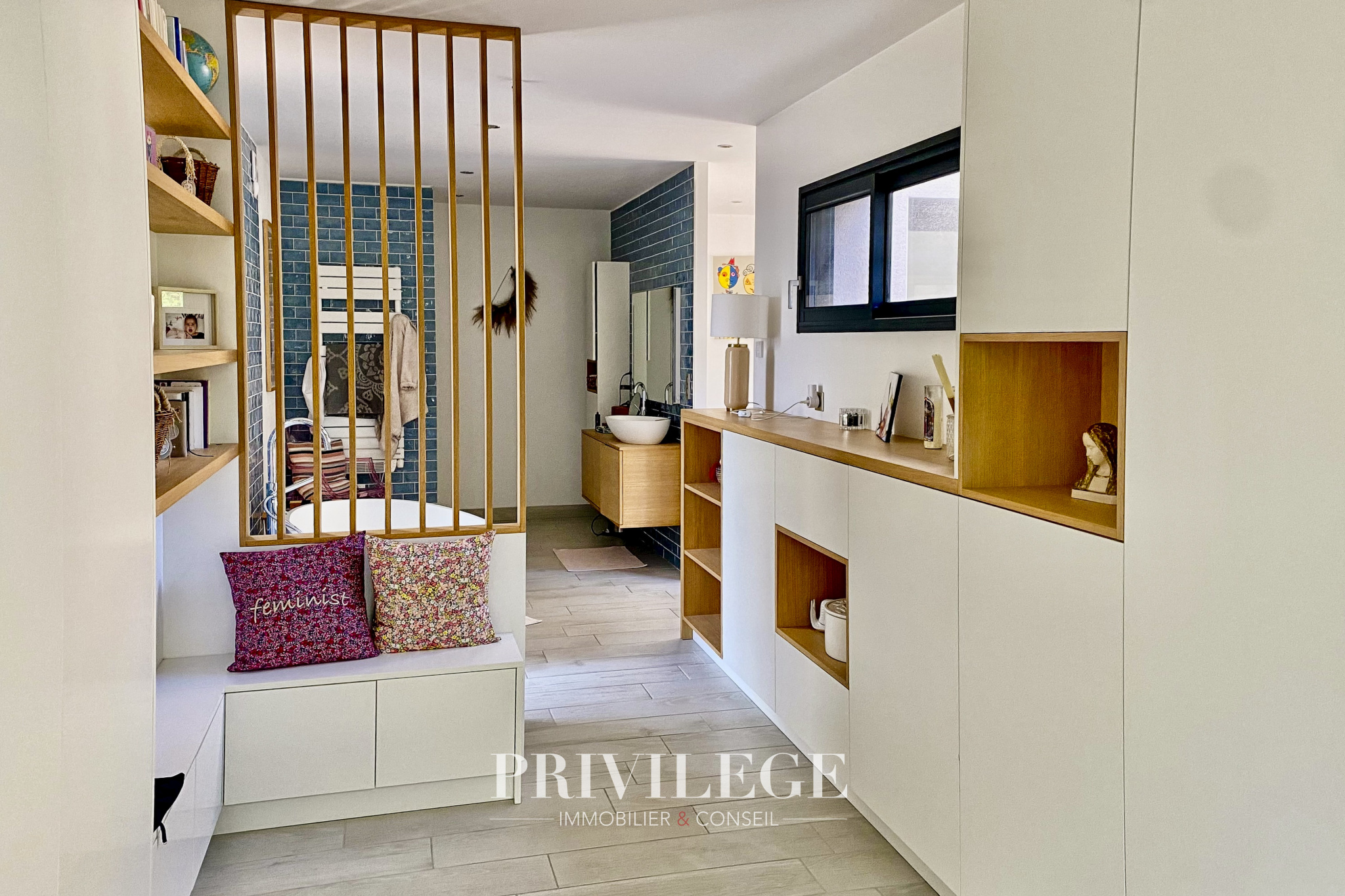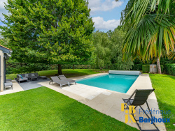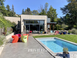 Dès l'entrée, la lumière est omniprésente. Les grandes baies vitrées dessinent un intérieur chaleureux, tourné vers un patio intérieur intime et un jardin arboré de 200 m², véritable havre pour petits et grands. Le séjour traversant de 45 m² invite aux réceptions comme aux moments de quiétude.