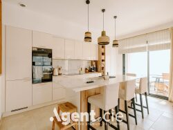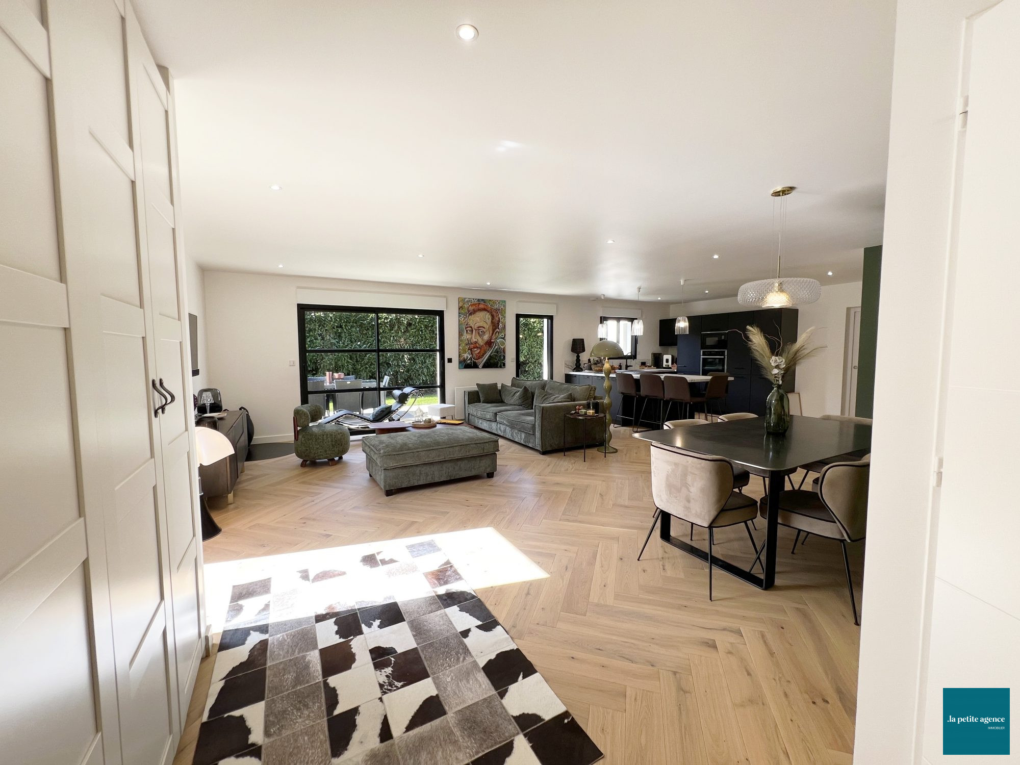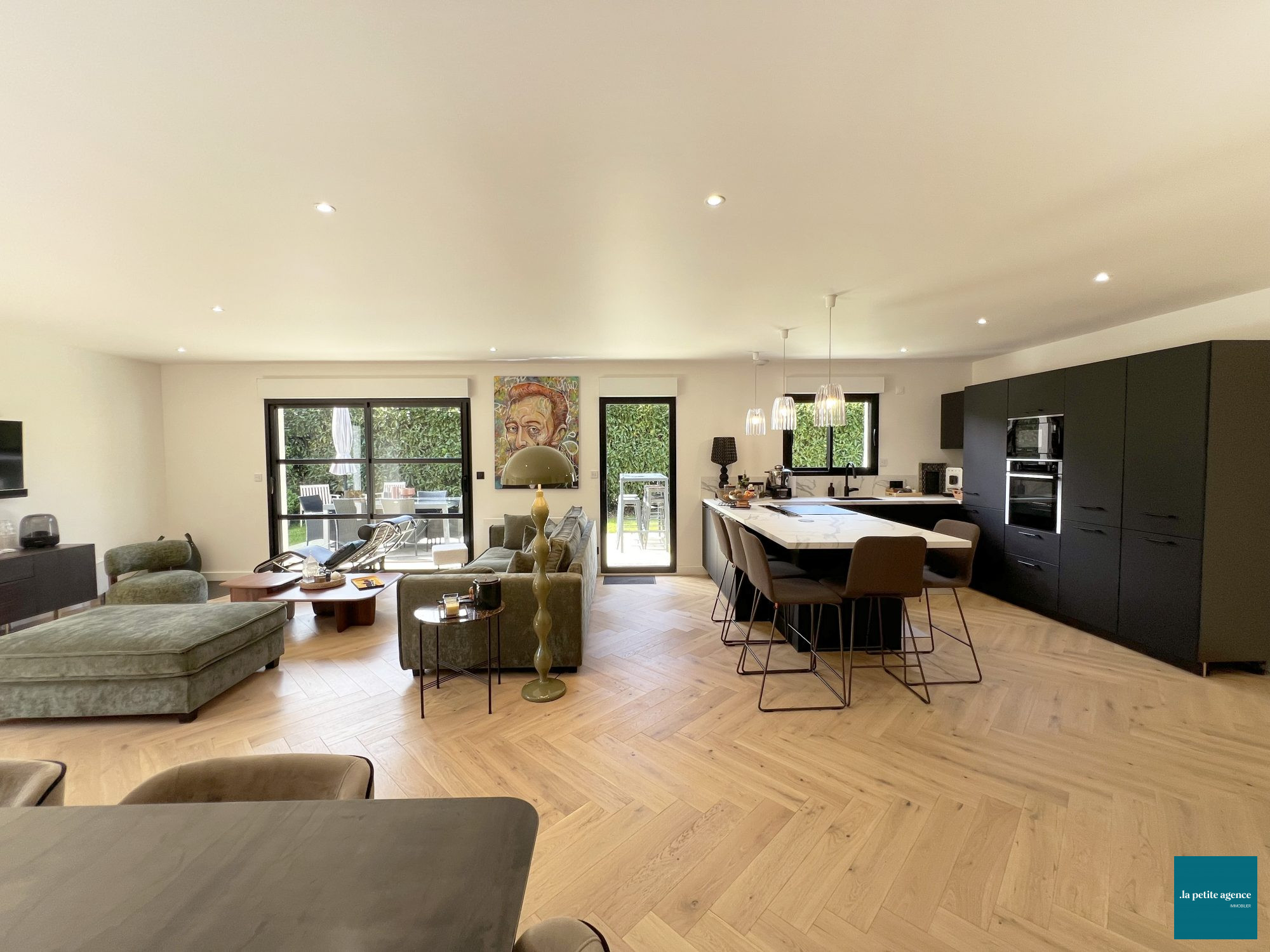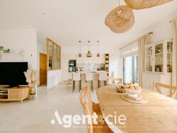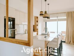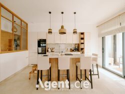 La cuisine ouverte, élégante et fonctionnelle, s'intègre harmonieusement à l'ensemble et constitue un véritable espace de partage.