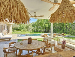 Le séjour spacieux et lumineux de 95 m² bénéficie de grandes baies vitrées donnant directement sur une terrasse couverte de 45 m² et sur une piscine à débordement. Cet espace extérieur est idéal pour profiter des moments conviviaux en famille ou entre amis.
