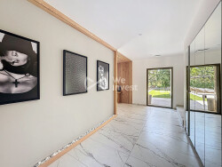 Le séjour spacieux et lumineux de 95 m² bénéficie de grandes baies vitrées donnant directement sur une terrasse couverte de 45 m² et sur une piscine à débordement. Cet espace extérieur est idéal pour profiter des moments conviviaux en famille ou entre amis.