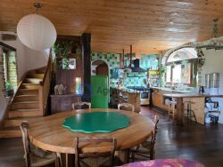 La partie grange, réhabilitée en habitation en 2014, propose une pièce à vivre claire et traversante de près de 55m² avec sa cuisine ouverte, son poêle de masse et sa belle hauteur sous plafond, une salle de bain avec douche à l'italienne et baignoire et ses toilettes séparées. L'étage est composé d'une chambre de 14m², un bureau avec petite mezzanine et d'une grande pièce de 40m² avec mezzanine pouvant servir de chambre, salle de jeux ou salon selon les projets.