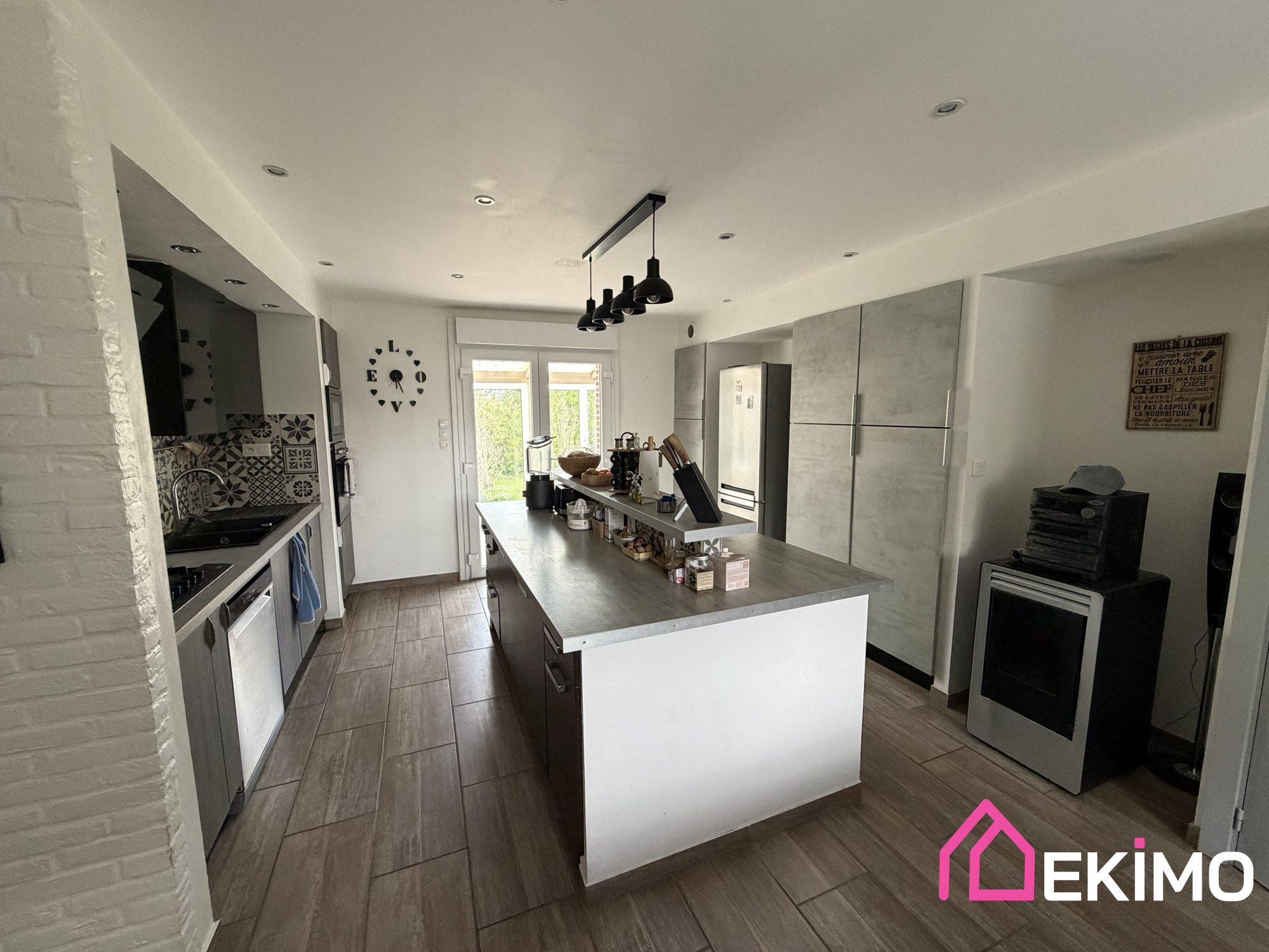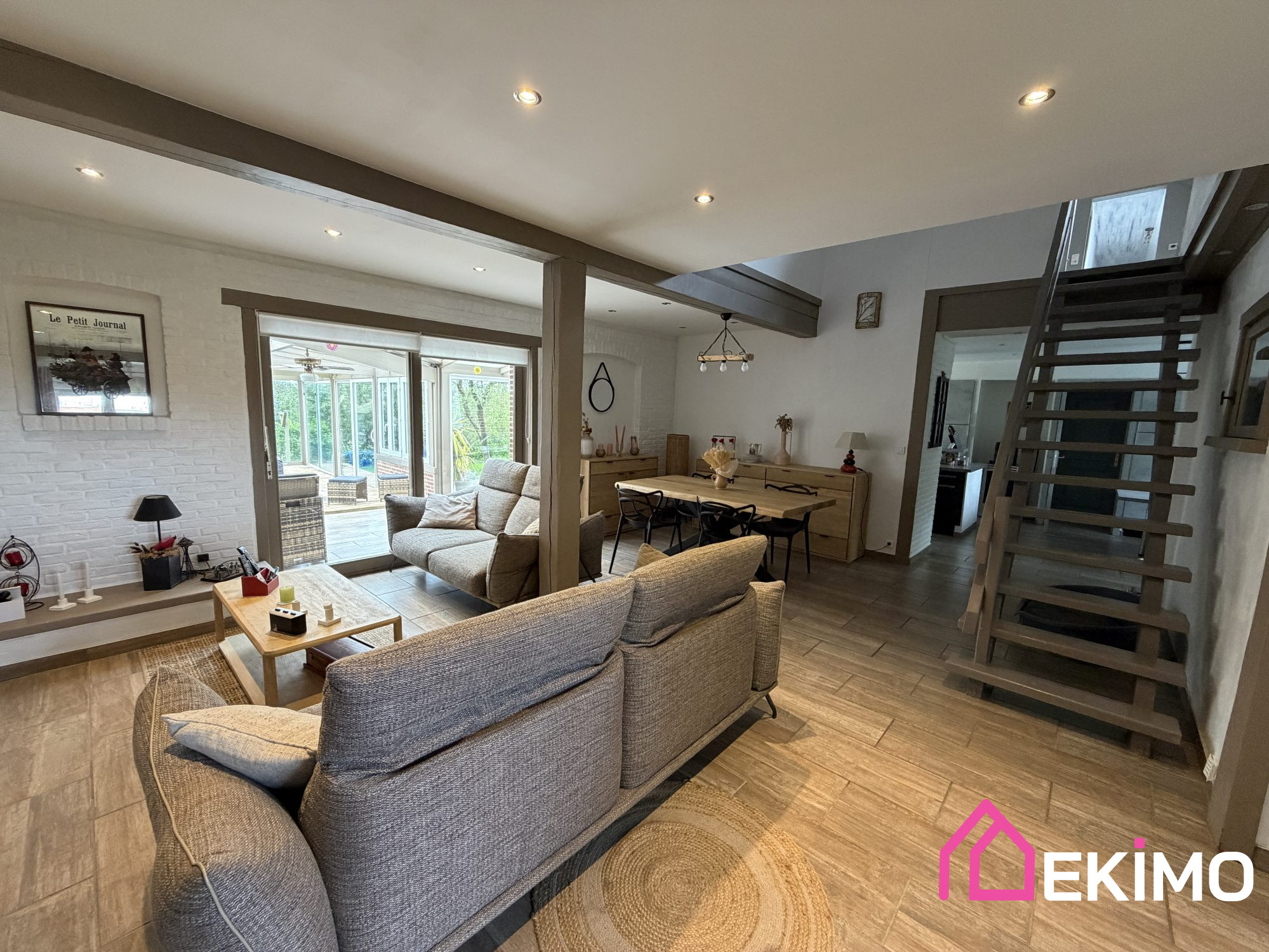 - étage : un séjour ouvert sur cuisine, une salle de bains, trois chambres, deux wc, un débarras, dressing.