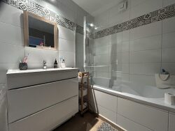 L'intérieur offre un espace de vie confortable et fonctionnel avec une cuisine équipée avec îlot central, un séjour, un salon agréable, 2 belles chambres, une salle de bains avec wc, un dégagement avec placard, un wc et enfin une cave.