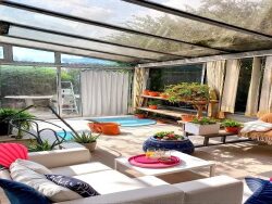 La maison est répartie comme suit : une cuisine semie ouverte avec salle à manger, un séjour avec accès au jardin et véranda couverte, 2 autres pièces pouvant servir de salon et/ ou atelier donnant sur la 2eme véranda couverte également, 4 chambres à l'étage avec une pièce atelier à renové, une salle de bain et wc séparé.