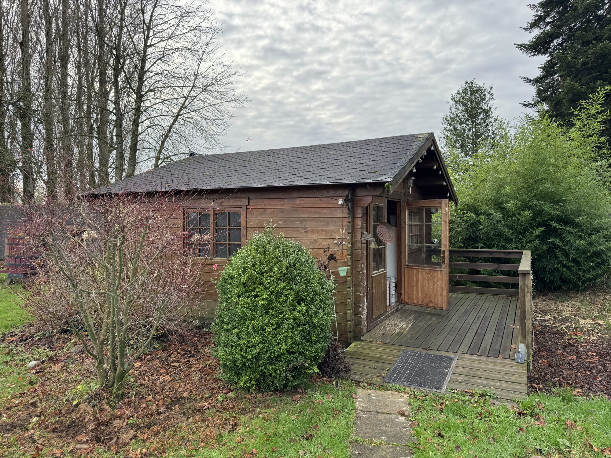 Attenant à la maison : une cour de 170 m² avec une terrasse en bois. Vous disposerez aussi d'une place de parking.