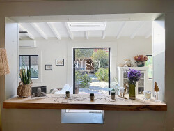 Elle se compose en rez de chaussée d'une cuisine entièrement équipée donnant sur un double séjour avec cheminée et salle à manger climatisée (60m²), un coin bureau, un garage et un toilette. A l'étage, trois belles chambres (14,13 et 10 m²) une salle de bain avec possibilité d'en créer une deuxième, ainsi qu'un toilette.