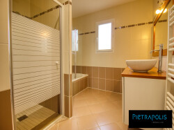 La maison se compose d'une grande pièce de vie avec cuisine aménagée et équipée, d'une salle de bains avec baignoire et douche, d'un WC indépendant, de 4 chambres dont une suite parentale ainsi qu'une buanderie et garage fermé.