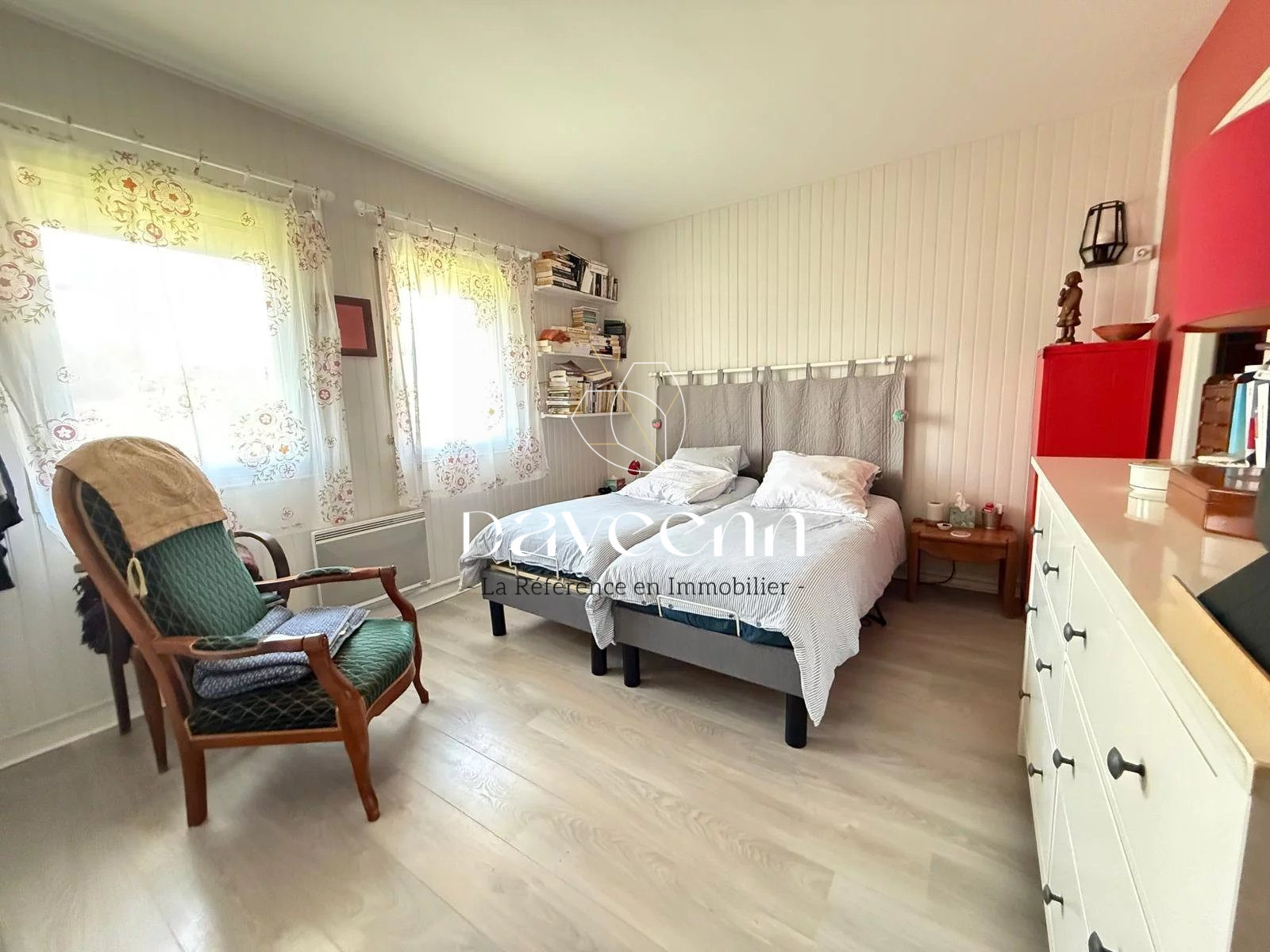 D'environ 110 m² habitables, elle se compose d'un vaste séjour de 45 m² avec cuisine ouverte, de quatre chambres dont une en rez-de-chaussée avec salle d'eau privative, ainsi qu'une salle de bain et un WC indépendant. La pompe à chaleur, la cuisine équipée, le garage et la grande terrasse de 35 m² ajoutent encore au confort de ce bien soigné.