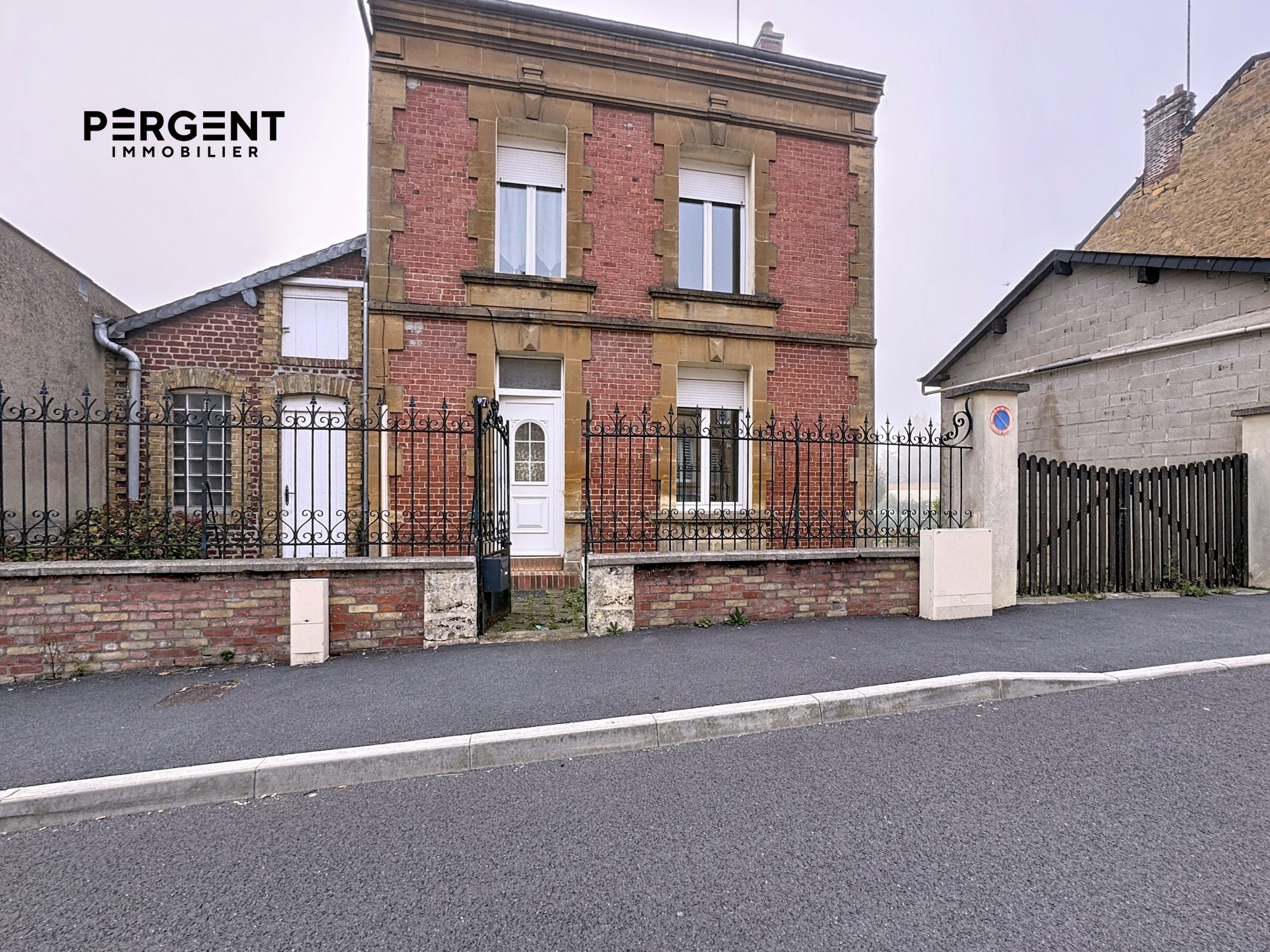 Une maison d'habitation comprenant: - Cuisine, salle à manger, une pièce noire, une salle de bains, garage et buanderie au rez-de-chaussée, - Trois chambres et grenier au premier étage, - Grenier au-dessus des chambres, - Terrain en nature de cours et de jardin en surélévation derrière.