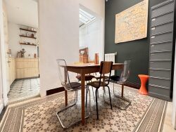 Maison 1930 rénovée avec cachet, jardin et garage à proximité du parc Barbieux, du tram et au calme Rez-de-chaussée : Entrée Vaste salon lumineux avec cheminée et parquet massif Salle à manger avec carreaux de ciment Cuisine semi-ouverte sur la salle à manger Salle de bain WC