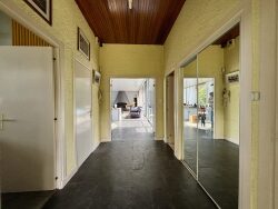 La demeure principale de 199 m² environ s'ouvre sur une entrée avec rangements, une vaste pièce de réception de 75 m² agrémentée d'une cheminée monumentale, une cuisine indépendante, deux chambres, une salle de bains, un bureau de 45 m² ainsi que deux toilettes. Le sous-sol se compose d'un garage, une pièce pouvant servir de bureau, une chaufferie et une cave. En complément, une dépendance d'environ 60 m² à rénover, au caractère architectural singulier, comprend deux chambres, une salle de bains, une kitchenette et un toilette. Les extérieurs comprennent une piscine, une grange aménagée de quatre box pour chevaux ainsi qu'une cave enterrée.