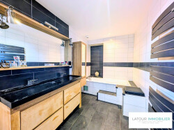 Le premier niveau propose une grande cuisine contemporaine ouverte sur une salle à manger de plus de 50 m², idéale pour recevoir en famille ou entre amis. On y trouve également un salon chaleureux, un bureau, un toilette indépendant ainsi qu'une salle de bain équipée à la fois d'une douche et d'une baignoire.