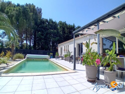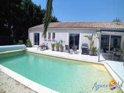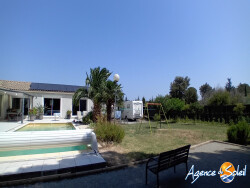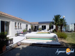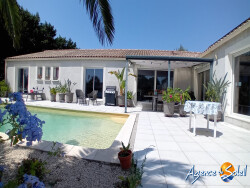 Prix en baisse ! Villa de 182m2 sur un terrain de 1100m2 et sa belle piscine et son garage. Composée d'une pièce pour l'entrée, elle vous dirigera sur la première aile de la villa qui peut vous offrir la possibilité de séparer l'habitation pour location de chambres d'hôtes avec ces 2 chambres avec placard et leur salle d'eau chacune, 1 toilette suspendu séparé et une pièce de vie avec coin cuisine et buanderie. La deuxième partie vous offre une agréable pièce de vie très lumineuse de 58m2 (2 baies vitrées et 3 fenêtres) avec la cuisine ouverte équipée d'un îlot central, 1 chambre parentale avec un dressing aménagé et une salle de bains double (bain et douche) et son toilette suspendu. Dotée de panneaux solaires, de chauffage et climatisation par gaine, elle propose un dpe B. Piscine 10.5×4.5 en dur au sel avec son local technique, possibilité de garer un camping-car sur l'espace stationnement. Le jardin vous propose un coin potager et un terrain de boules. Toutes les chambres et pièces de vie ont la vue sur le jardin et la piscine. Quartier calme entouré de nature, jolie vue. Zone inondable jamais inondée, vide sanitaire de 70cm. Station avec buse, construction de qualité. Contactez-moi France 06.84.64.78.48