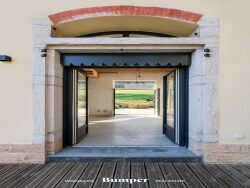 La grande terrasse de près de 60 m² s'ouvre sur un jardin minéral et une vue dégagée sur le parc arboré de 2,4 hectares.