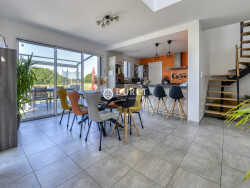 Côté technique : Chauffage par pompe à chaleur au sol + ballon thermodynamique VMC simple flux Hygro B Menuiseries K-Line aluminium double vitrage Garage de 28 m² Deux places de stationnement privatives en enrobé Fibre optique, tout-à-l'égout, décennale encore en cour Terrain : 563 m² clos et paysagé